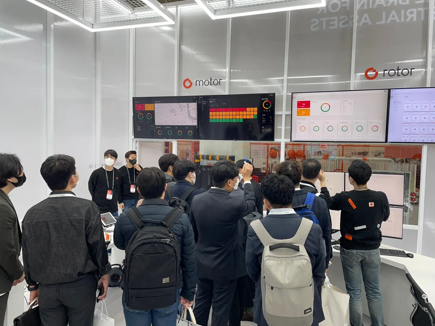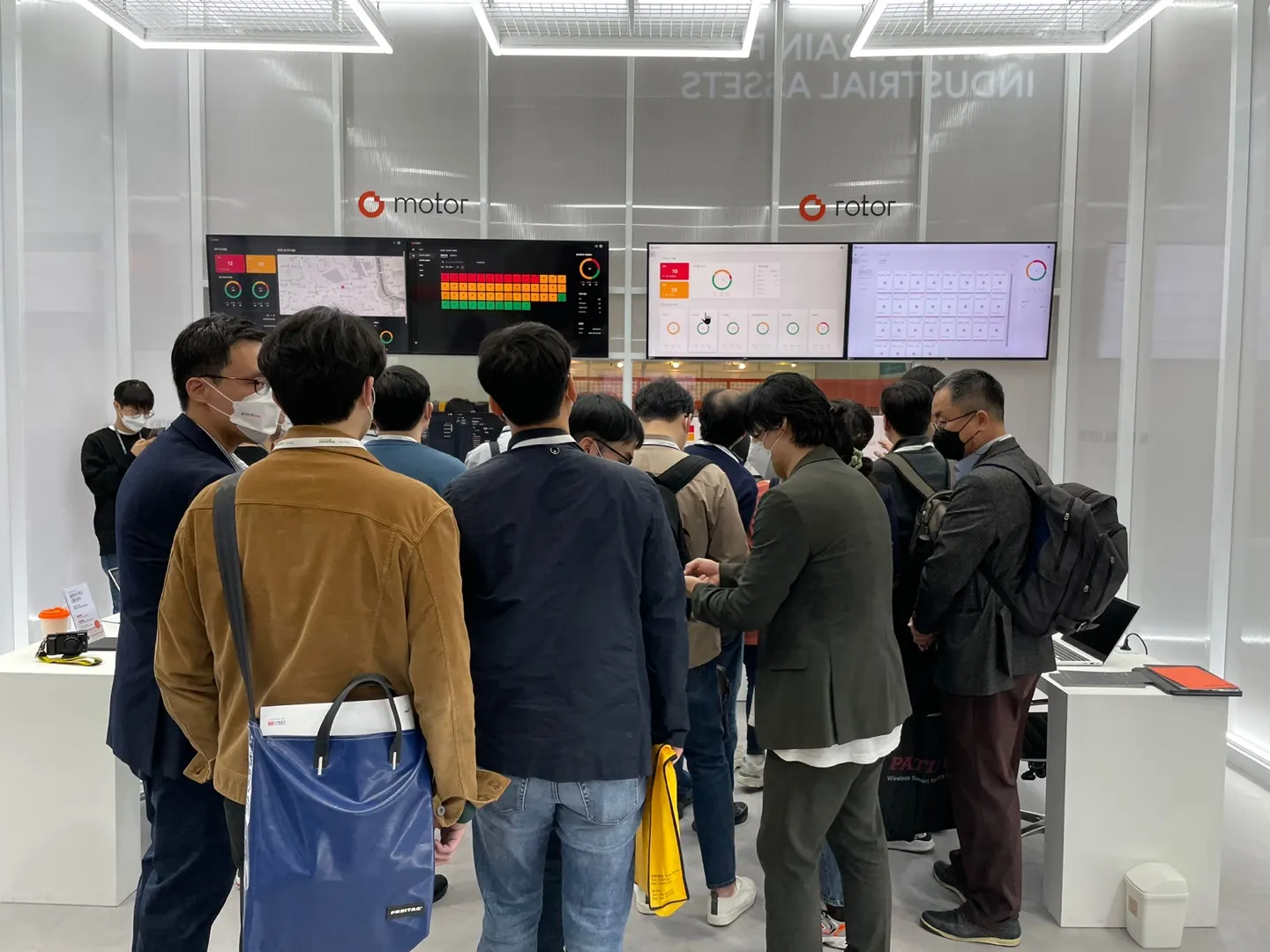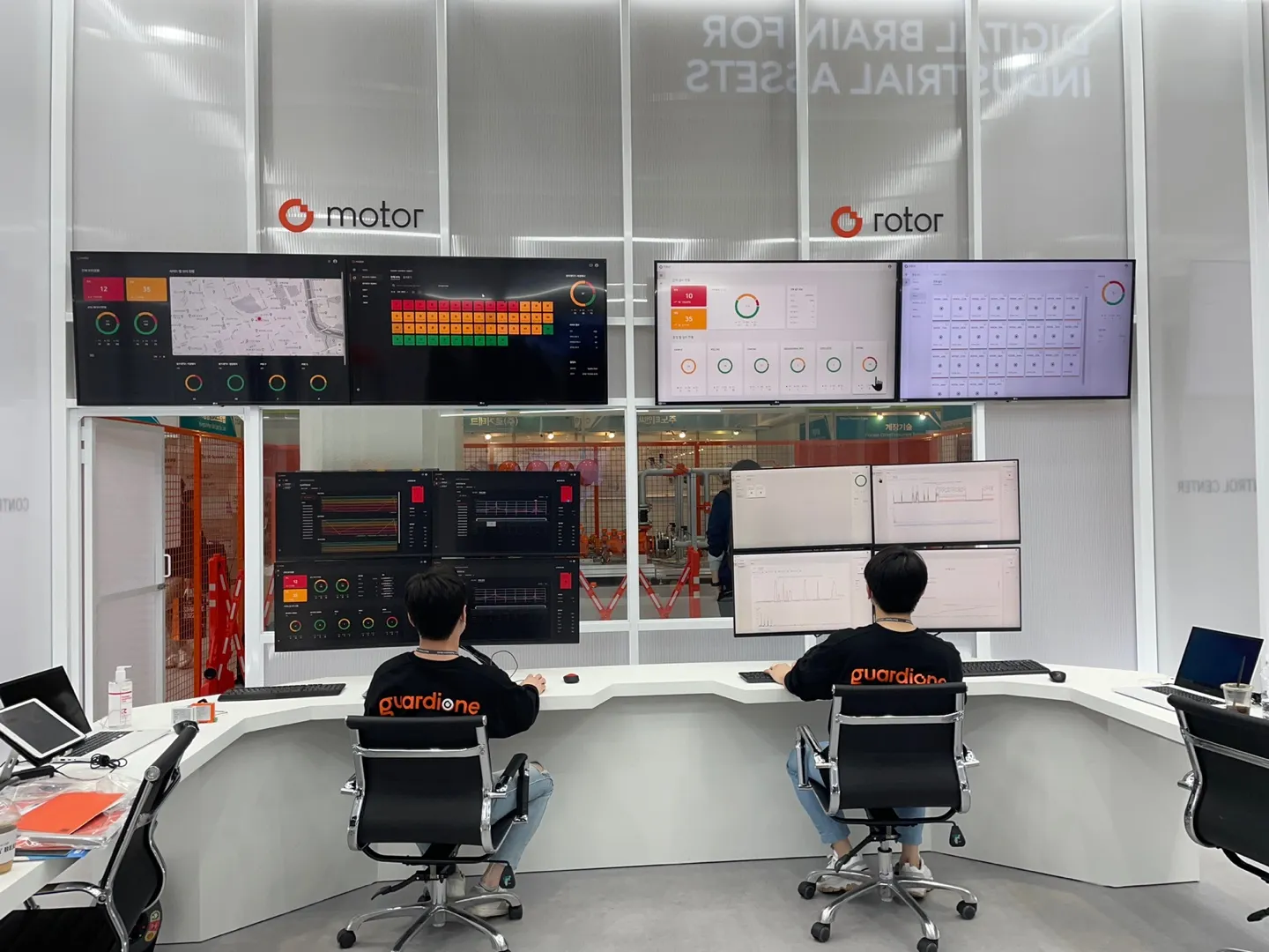 네모반듯한 부스 안에는 가디원 모터 및 가디원 로터(출시 예정..!)의 대시보드가 실제 관제실처럼 배치되었습니다. 이 공간에서 참관객들은 가디원 솔루션이 제공하는 대시보드 화면들을 직접 클릭도 해보고, 설비 상태에 따라 실시간으로 진단 내용이 변하는 모습도 확인할 수 있었습니다.