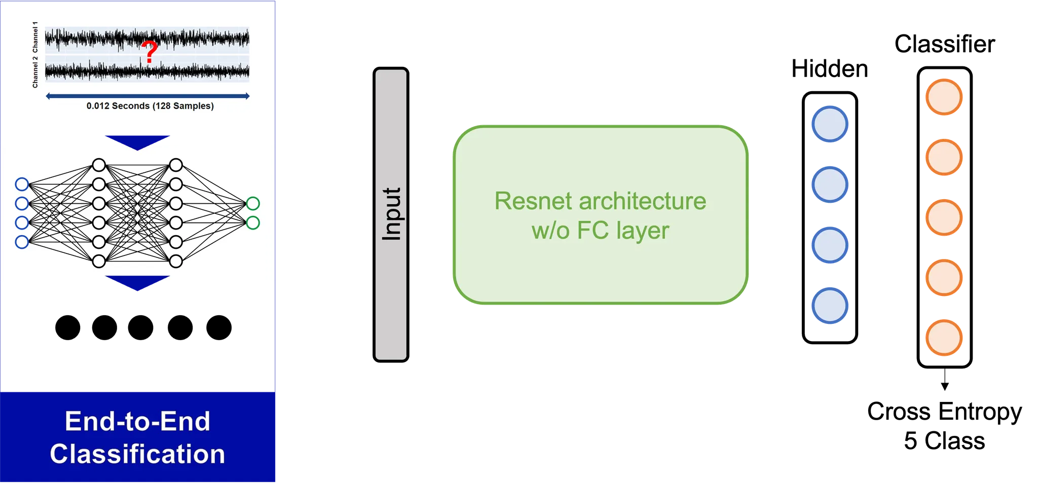 자 그러면 다시 1-Dimensional CNN으로 돌아와서, 우선 다음과 같은 End-to-End 모델을 고려해볼 수 있습니다. 입력값으로는 주어진 0.012초의 두 채널 데이터를 사용한다고 할 때, 이는 2채널짜리 이미지로, 즉 128x1x2 (width x height x channel) 이미지로 생각할 수 있습니다. 기존에 이미지에서 pre-train 되어있는 모델을 활용한다고 할 때, 이를 위해서는 다음의 두가지 조건이 만족되어야 합니다.