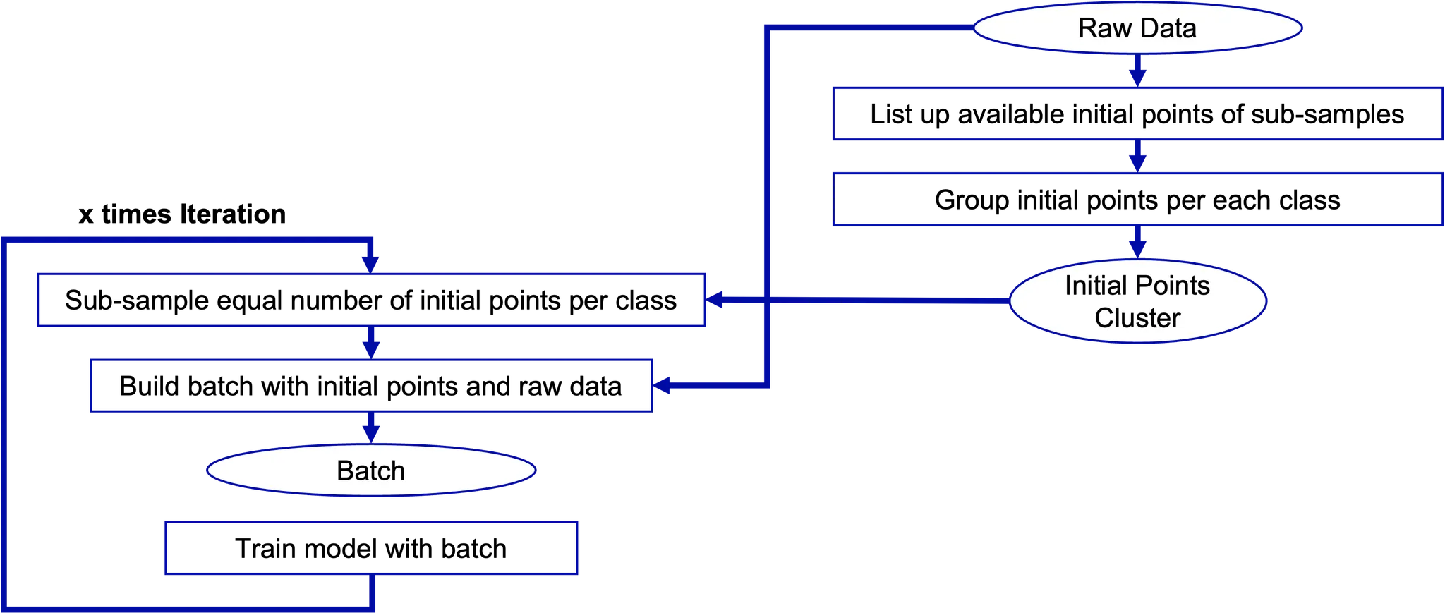 가장 쉬운 방식은 모든 가능한 sub-sample을 만들어 놓고, 이들을 섞어서 배치를 만드는 방법입니다. 일반적인 Batch-Epoch 디자인에도 가장 적합하고 데이터를 낭비없이 모두 사용할 수 있다는 장점도 있습니다. 하지만 치명적인 문제가 두가지 발생할 수 있는데요, 첫번째로는 데이터가 너무 많다는 것입니다. 앞에서 언급한것처럼 활용가능한 sub-sample의 갯수는 237,314,656개, 중첩을 배제한다고 해도 1,854,020개의 데이터를 갖게 됩니다. 이 데이터를 모두 훈련에 활용한다면 1 Epoch에 소요되는 시간이 너무 오래걸리게 됩니다. 또다른 문제로는 각 상태에 따른 데이터량이 불균형(Imbalance)하다는 점도 있습니다. 특히 Normal 상태의 데이터가 총 5,500s 정도인 반명 Losseness-High의 데이터양을 416s정도로 1/10에 불과합니다. 만약 단순하게 랜덤셔플링을 통해 배치를 구성한다면 대부분의 배치에서는 Normal에 편향된 훈련이 이뤄질 가능성이 높습니다.
