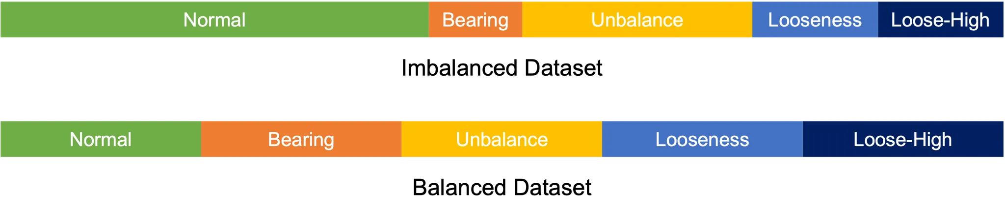 따라서 저희는 Batch-Epoch 디자인 보다는 Batch-Iteration 전략을 취하기로 했습니다. 즉 Batch Sampling을 저희가 정한 Iteration 만큼 수행하는 것이지요. 이 경우 누락되는 데이터가 발생할 수 있다는 단점이 있지만 훈련 양을 보다 자유롭게 선택할 수 있다는 이점이 있습니다. 또 모든 Batch Sampling에서는 각 상태의 데이터를 동일량 샘플하도록 하였습니다. 예를 들어 전체 Batch Size가 100이라면 20개는 Normal에서, 20개는 Unbalance에서 샘플링하는 식이지요. 이를 통해 훈련 과정에서 소수의 데이터도 충분히 노출시켜서 특정 상태에 편향되는 것을 방지하고자 하였습니다. 다만 이렇게 할 경우 데이터량이 적은 클래스에 대해 Overfitting이 발생할 수 있는데요, 다행히도 저희는 충분히 많은 데이터를 가지고 있기때문에 이런 위험성은 낮을것이라고 예상하였습니다.