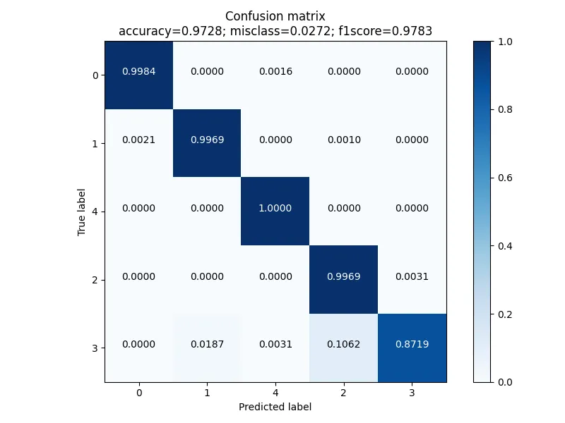과연 그렇다면 결과는 어떻게 나왔을까요? 우선 Confusion Matrix를 이용해서 성능을 평가해보면 다음과 같습니다. [0:Normal, 1:Unbalance, 4:Bearing Fault, 2: Belt-Looseness, 3: Belt-Looseness High)