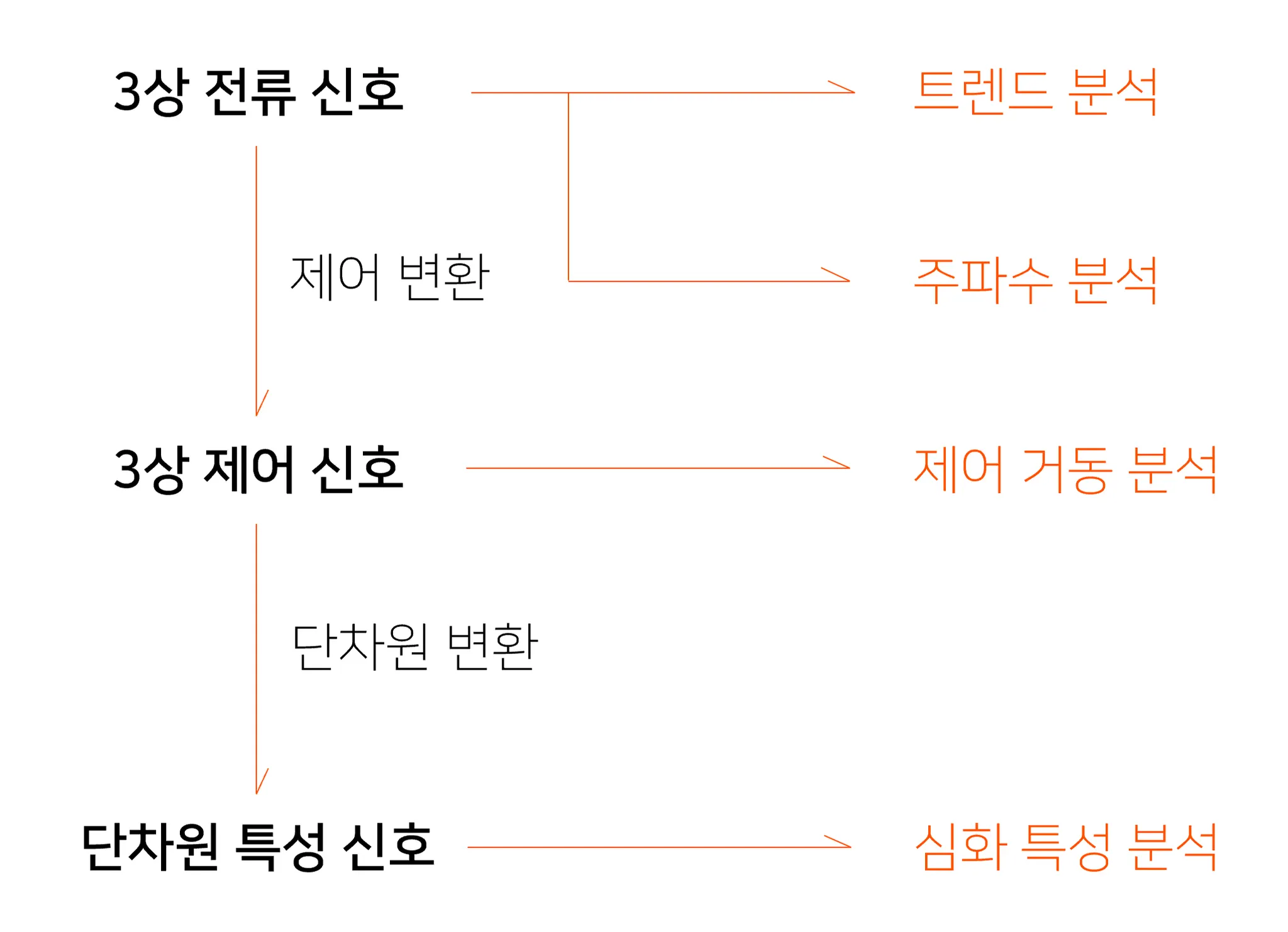 STEP 1 U, V, W 3개 신호는 서로 상관관계를 가지고 있는데, 모터에 결함이 발생하면 이 상관성에도 영향을 미치게 됩니다. 이 상관성을 보기 위해 제어 변환이라는 방식을 활용했습니다. 제어 변환은 명칭에서 알 수 있듯 원래 제어 과정에서 상관성을 보기 위해 활용되는 개념인데 여기에도 도입이 된 거죠.