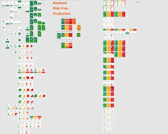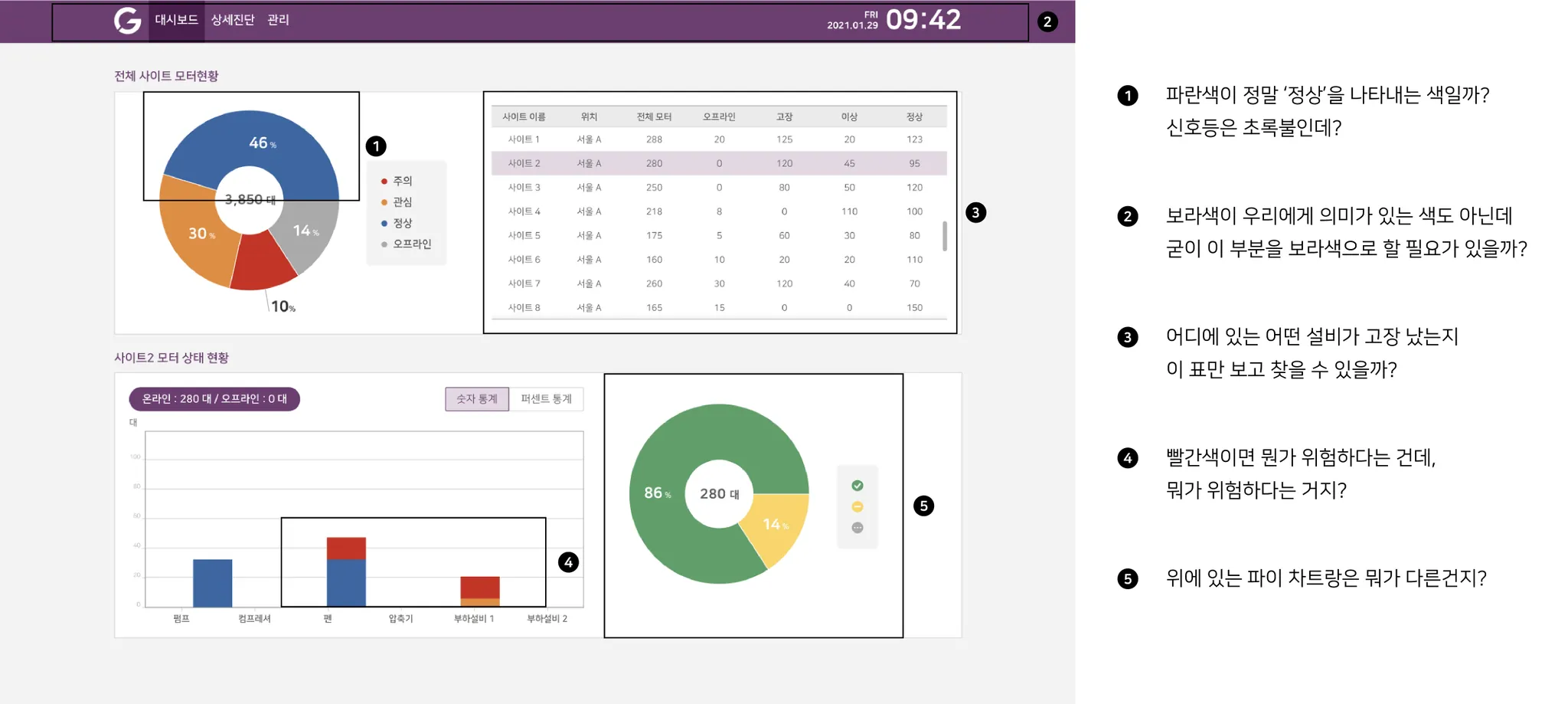 민상 - 저도 비슷한 의미긴 한데, 안경을 벗고 모니터를 보더라도 혹은 스쳐 지나가더라도 설비에 문제가 있다는 걸 알아차릴 수 있는 대시보드를 제공한다는 게 가장 차별화 포인트라고 생각해요. 그런 화면을 만들기 위해 실제로 수백개에 달하는 디자인 시안을 만들기도 했고, 일부러 흐린 눈으로 모니터를 보거나 멀리서 흘겨보면서 중요한 정보가 한 눈에 들어올 수 있도록 저희끼리 테스트해봤죠.