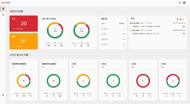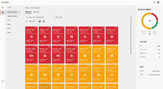 지운 - 주 사용자 층을 고려하며 페이지를 디자인한 것도 고객들이 유용하게 활용할 수 있는 요소에요. 전체 대시보드는 관리할 포인트가 많은 관리자분들이 한 눈에 전체 현황을 파악하기에 좋고, 개별 모터의 상태를 직관적으로 보여주는 카드 뷰는 현장에서 모터를 직접 관리하시는 실무자분들께 유용할 거에요.