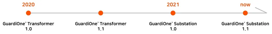 그래서 원프레딕트는 실무자들의 업무 부담은 최소화하고, 변압기 운용 환경의 안전은 극대화하기 위해 가디원 ‘트랜스포머’를 출시했었습니다. 가디원 서브스테이션에 대해 얘기한다더니, 트랜스포머는 갑자기 어디서 나왔냐고요? 가디원 트랜스포머는 가디원 서브스테이션의 전신입니다. 혹시라도 헷갈리실 분들을 위해, 아래 표를 통해 가디원 서브스테이션의 연대기를 한번 정리해봤습니다.